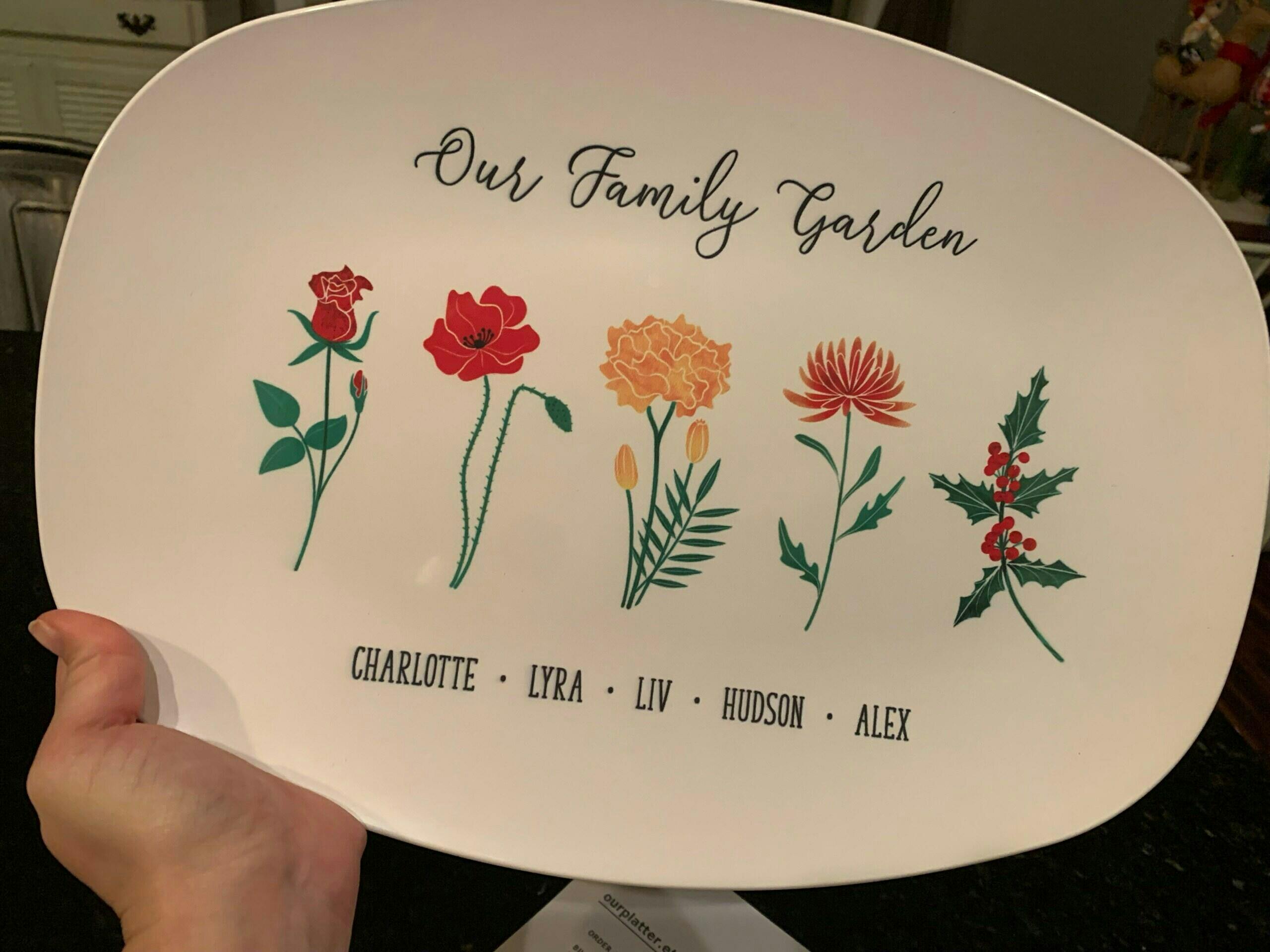 Create a one of a kind special platter with birthday month flowers for each family member. You will love our durable, BPA-free plastic resin platters custom made just for you. Dishwasher and Microwave safe is always a plus!