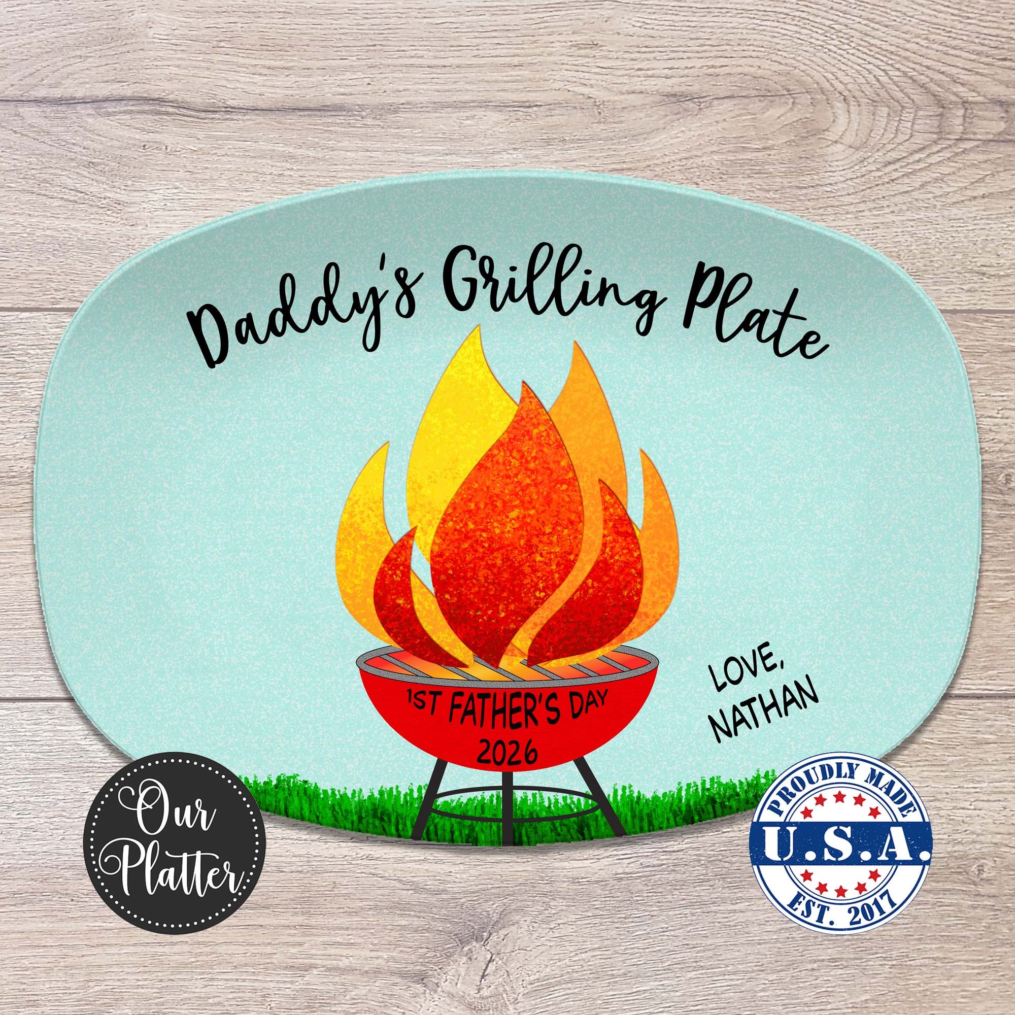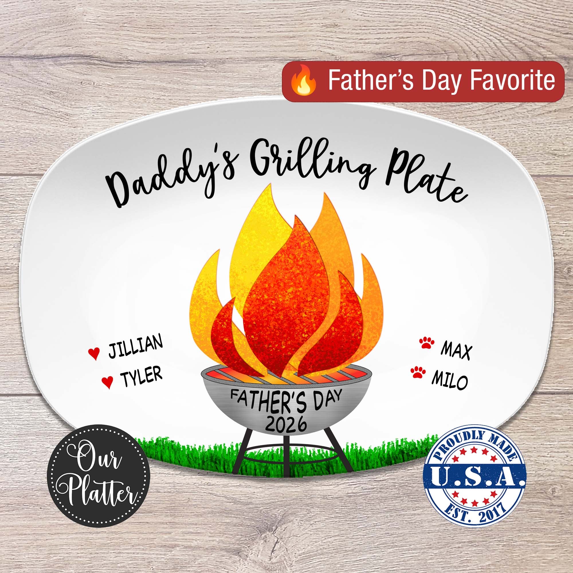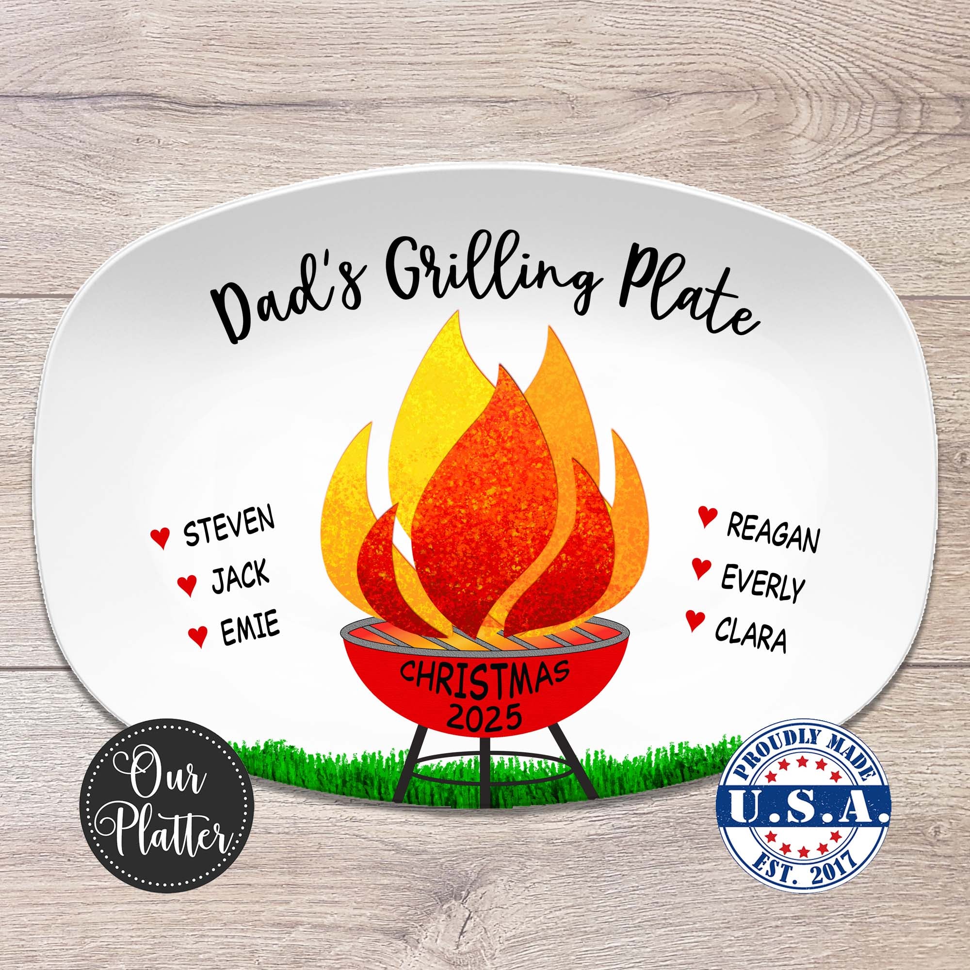 Give the grill lover Dad or Grandpa a thoughtful, personalized gift from the kids and pets! Colorful grill with flames and personalized text in a 10x14" platter made of a quality, durable plastic resin that is BPA-free. Dishwasher and microwave-safe.