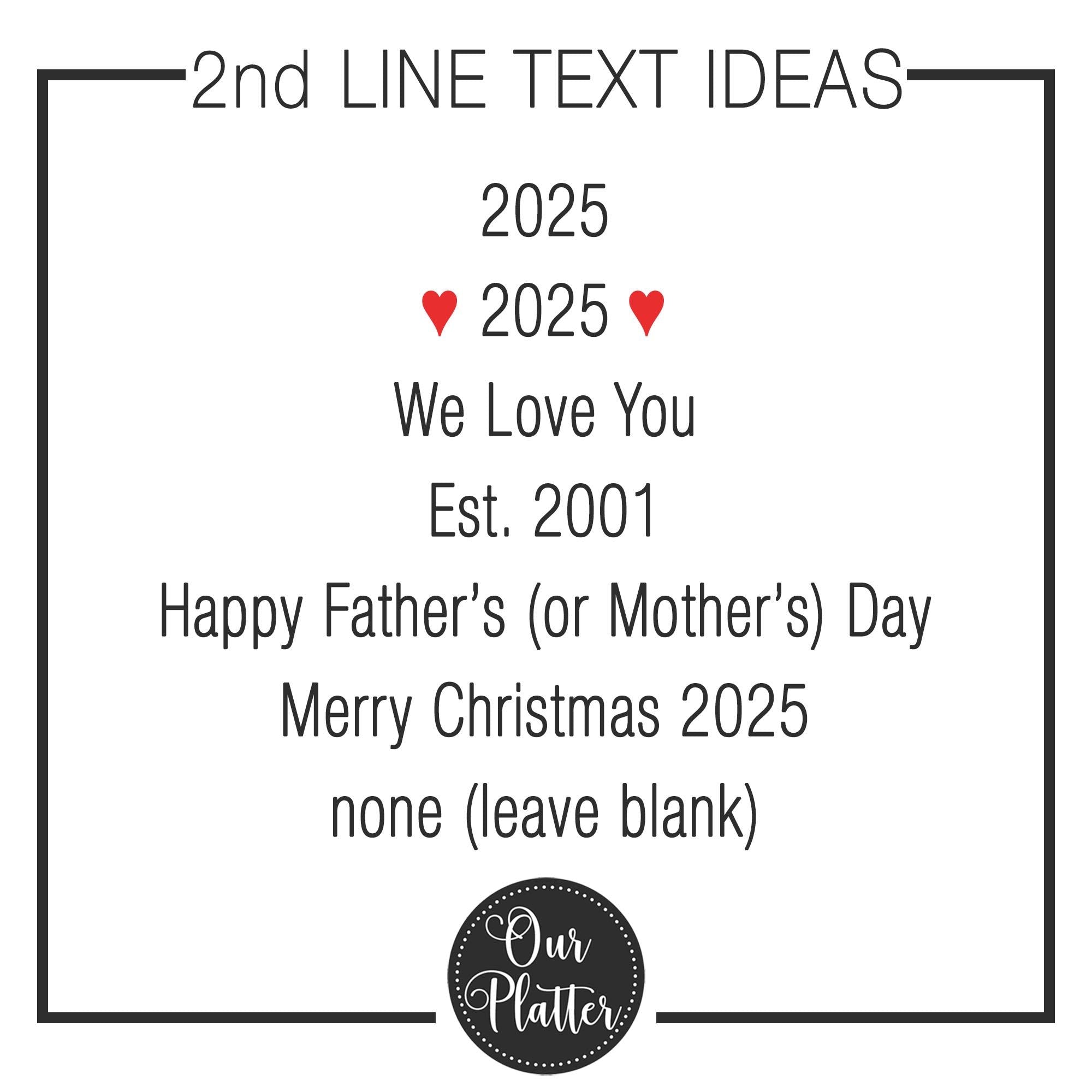 We use our design expertise for the best placement of text and graphics on each platter based on your individual selections. Actual colors may vary due to monitor settings. Small imperfections reflect the hand-made and unique nature of the printing process. Design elements such as wood, glitter, metallic, are all faux printed designs.