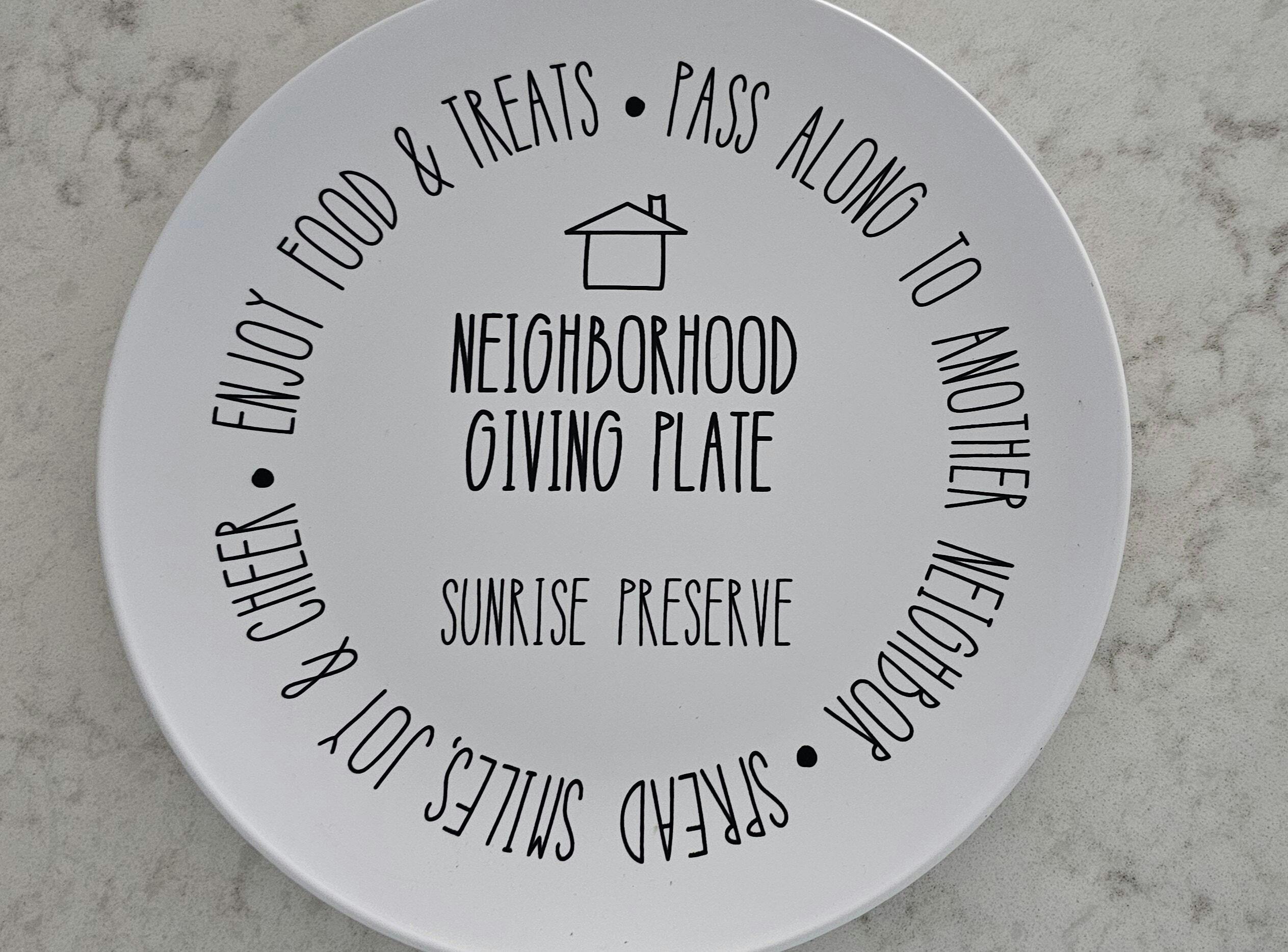 A neighborhood giving plate is a fun, new tradition to start to spread a little cheer within your neighborhood. The neighborhood giving plate is customized with your neighborhood name. Use it to deliver a special treat to a neighbor and let them spread the joy to the next neighbor. Leave it behind and they can use it when they want to do the same. The plate makes its way from neighbor to neighbor and leaves a little smile along the way.
