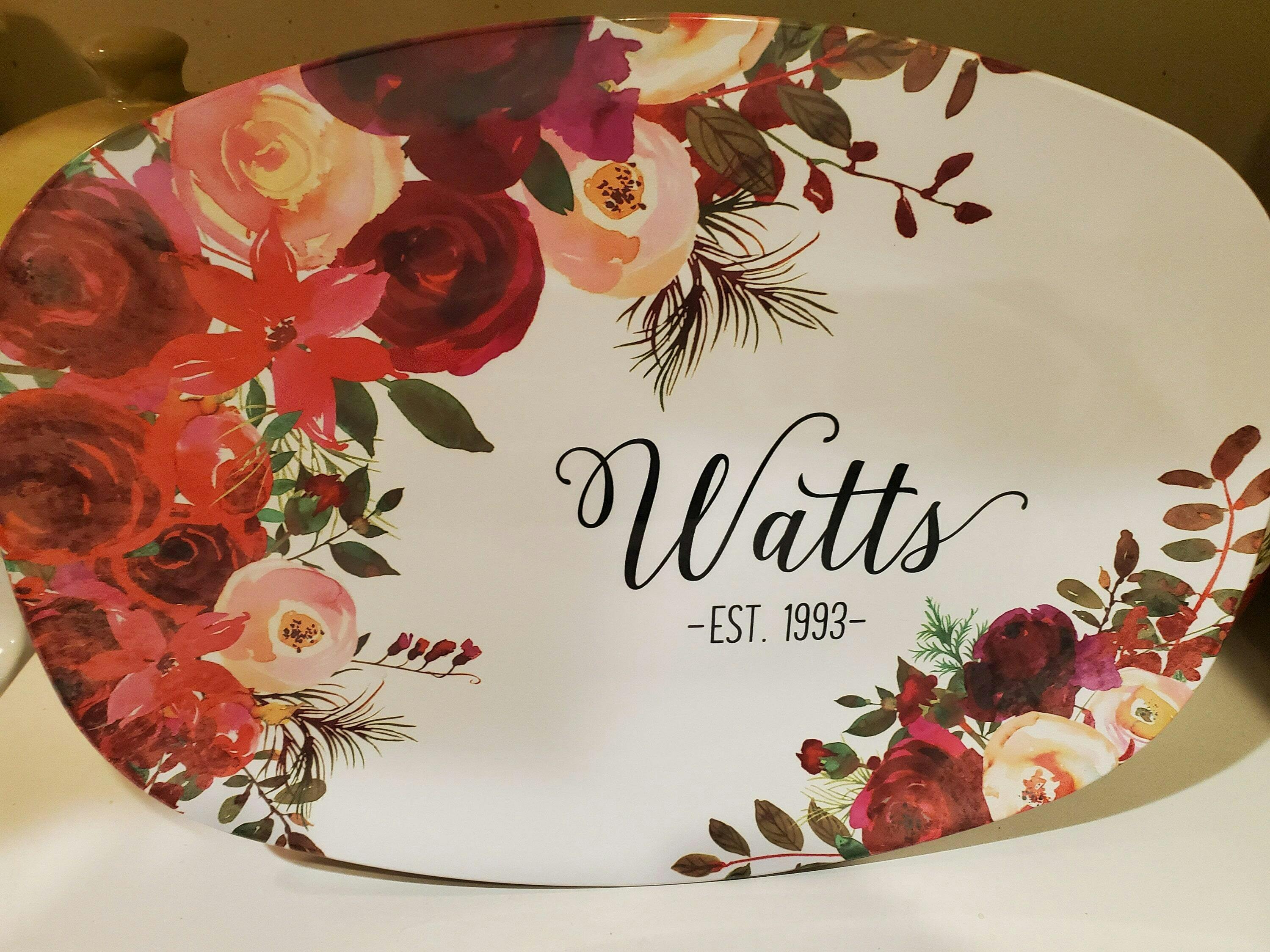 Our floral personalized platter makes a thoughtful gift for any occasion. You will love our durable, BPA-free plastic resin platters custom made just for you. Dishwasher and Microwave safe is always a plus!
