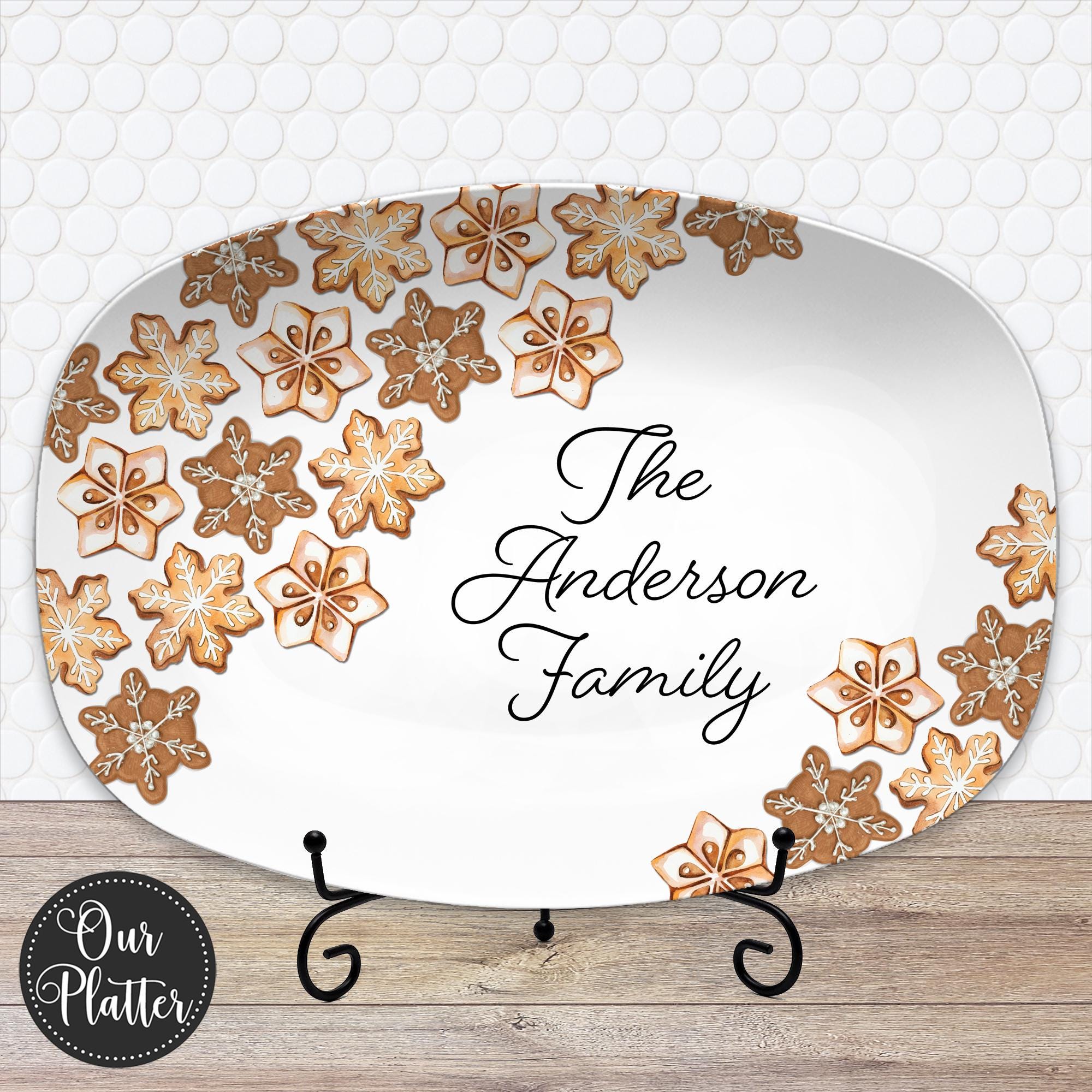Bring warmth and joy to your holiday table with this Personalized Christmas Cookie Platter, featuring a charming snowflake cookie design. A festive keepsake perfect to commemorate a first Christmas, co-worker gift, teacher appreciation, or family gift. This platter is a festive keepsake thatโs perfect for serving cookies, desserts, or Christmas treats.