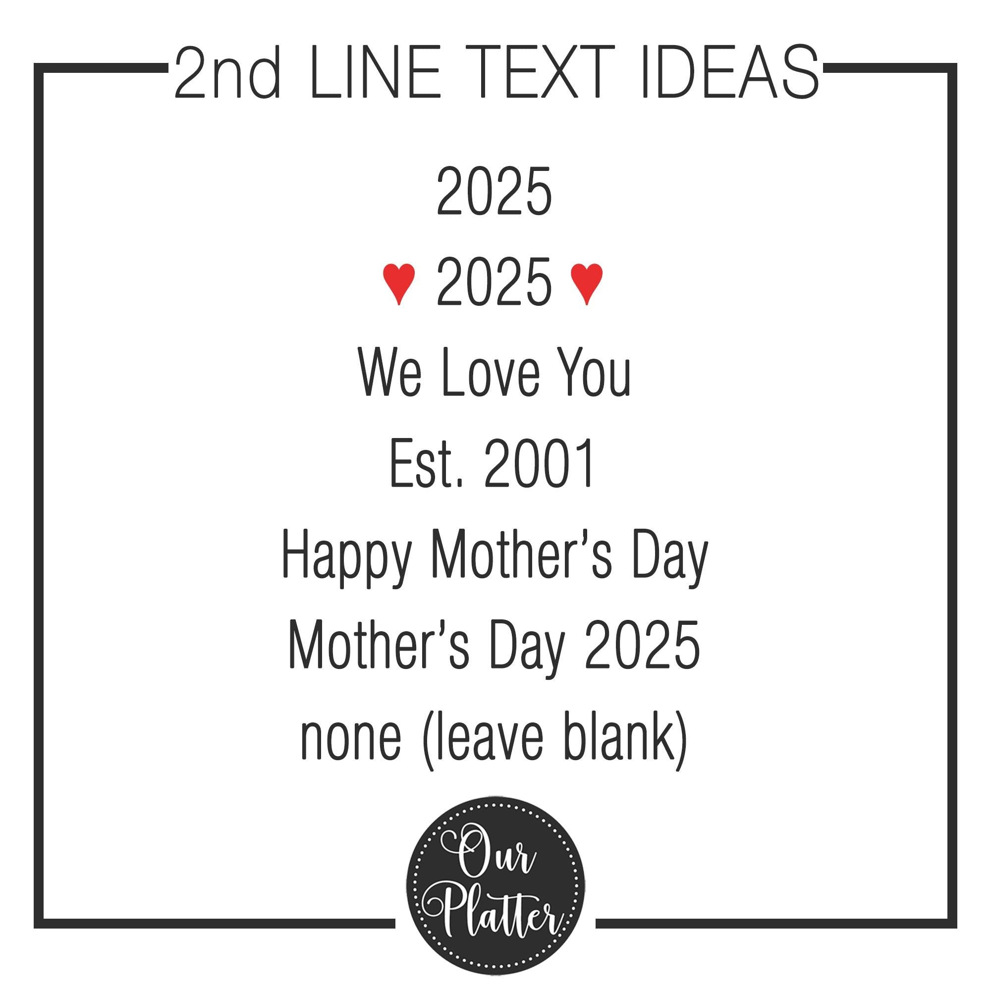 We use our design expertise for the best placement of text and graphics on each platter based on your individual selections. Actual colors may vary due to monitor settings. Small imperfections reflect the hand-made and unique nature of the printing process. Design elements such as wood, glitter, metallic, are all faux printed designs.